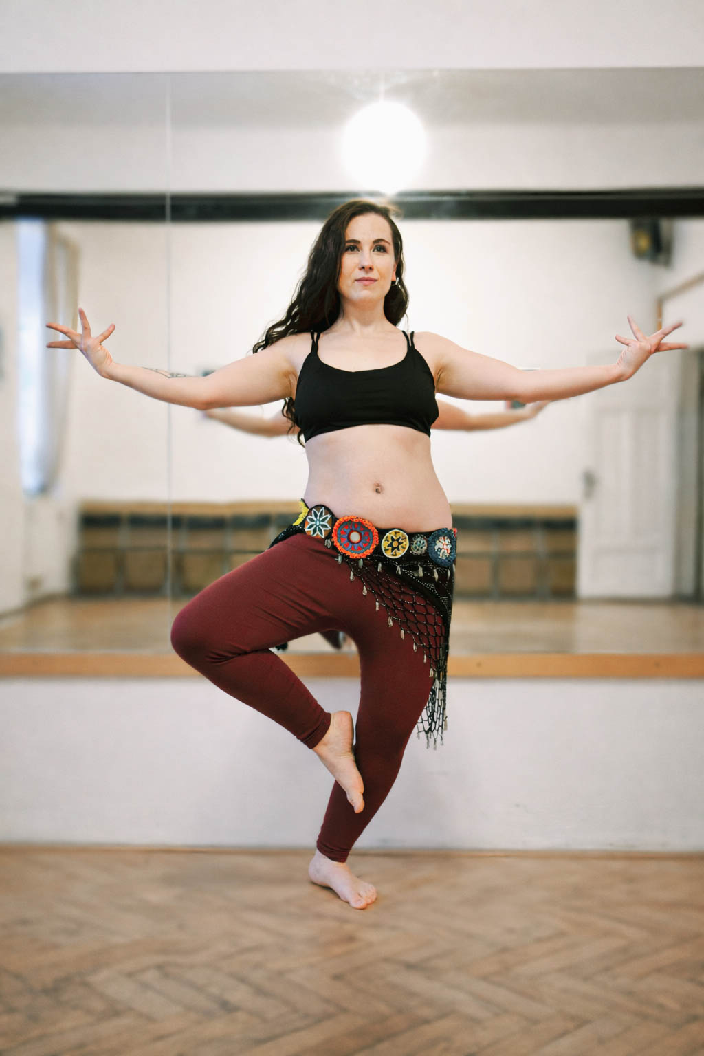 správnou taneční techniku Fusion Bellydance: izolace (boky, hrudník, bříško, paže a další), layering- vrstvení izolací a pohybů, práce v prostoru